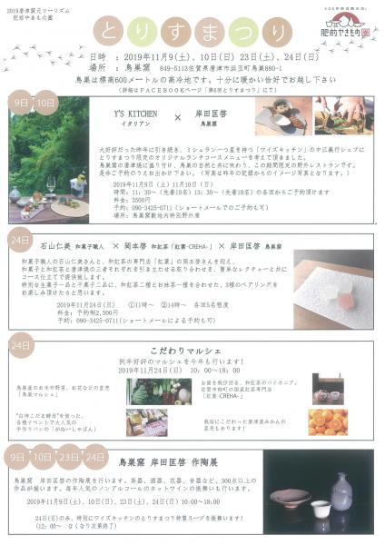 | 交通指南 | 【福岡・唐津方面から】 二丈浜玉道路(西九州道)浜玉ICより、佐賀七山方面へ。 玉島交差点を平原方面へ右折、約9キロ直進後、左手にとりす高原、右手に鳥巣分校を見ながら直進。 突きあたり手前すぐ左手が鳥巣集会場、道を挟んで東側の小道をあがると鳥巣窯です。 【佐賀方面から】 佐賀大和ICから古湯温泉へ。古湯温泉から278号線(または276号線)利用。 |