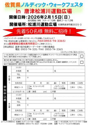HOME 唐津の9つの魅力 唐津介绍 唐津介绍 唐津的美食介绍 観光地のご紹介 祭り・イベントのご紹介 唐津烧介绍 特产品介绍 住宿设施介绍 历史文化介绍 餐饮 唐津的美食介绍 ジャンル検索 观光地 観光地のご紹介 观光搜索 体验计划 体验计划搜索 节日、活动 祭り・イベントのご紹介 ジャンル検索 唐津烧 唐津烧介绍 ジャンル検索 特产品 特产品介绍 ジャンル検索 住宿设施 住宿设施介绍 ジャンル検索 历史文化 历史文化介绍 ジャンル検索 交通アクセス 新着情報 推荐线路 唐津のおすすめ パンフ・ガイドマップ フォトライブラリー 视频集 最多浏览 经常有的疑问 Facebook リンク集 閉じる Language 日本語 English 한국어 中文(繁体字) 活动信息 最多浏览 イベントを検索する 佐賀県ノルディック・ウォークフェスタ in 唐津松浦川運動広場 唐津市区 スポーツ 開催日 2026年2月15日(日) 時間 受付開始:9時 スタート:10時 最終ゴール:12時 住所 佐賀県唐津市鏡3035-3(松浦川運動広場) 電話番号 0955-75-3031 佐賀県ノルディック・ウオーク連盟 白井接骨院 平日9時~20時 料金 先着50名様 無料ご招待! 関連資料 参加申込書 [PDF] Tweet 地図 ナビ起動 オススメのイベント情報 玄海町ARスタンプラリー 宝満神社の大門松