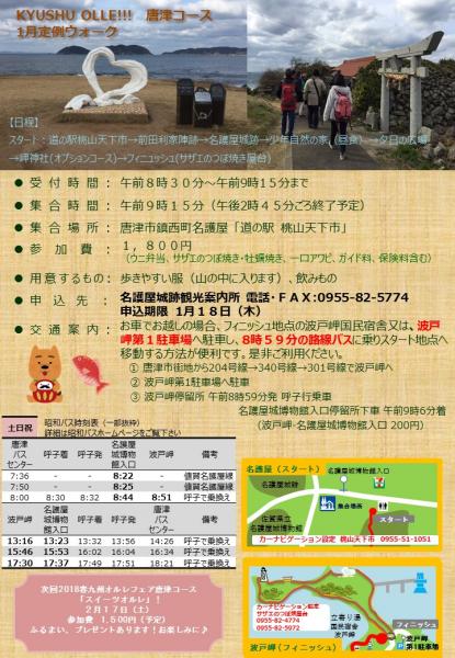 | Access | お車でお越しの場合、フィニッシュ地点の波戸岬国民宿舎または、波戸岬第1駐車場へ駐車し、8時59分の路線バスに乗ってスタート地点へ移動する方法が便利です。 ① 唐津市街地から204号線→340号線→301号線で波戸岬へ ② 波戸岬第1駐車場へ駐車 ③ 波戸岬停留所 午前8時59分発 呼子行乗車 名護屋城博物館入口停留所下車 午前9時6分着 (波戸岬-名護屋城博物館入口 200円) |