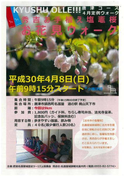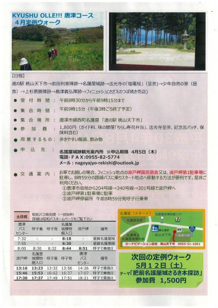 | Access | ・カーナビゲーション設定は (桃山天下市0955-51-1051) ・参加される方は、フィニッシュ地点の波戸岬国民宿舎ないし波戸岬第一駐車場 にとめて、波戸岬停留所から8:59発呼子行き路線バスで、スタート地点の名護 屋へ移動する方が便利です。 |