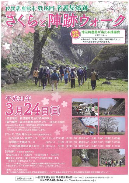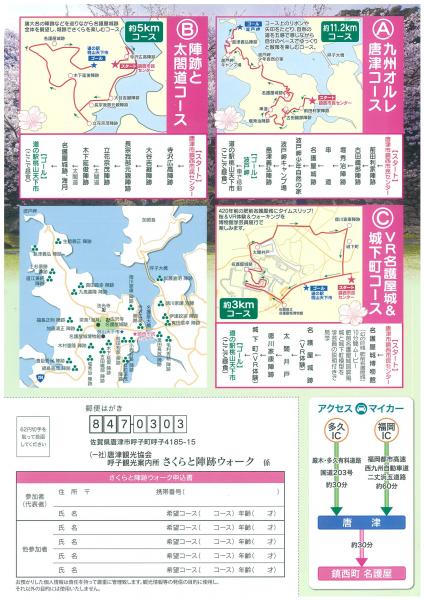 | 時間 | 九州オルレ唐津コース ・受付 8:30 ・開式 8:45 ・出発 9:00 ・到着 13:00頃 陣跡と太閤道コース ・受付 9:30 ・開式 9:45 ・出発 10:00 ・到着 12:00頃 VR名護屋城&城下町コース ・受付 9:30 ・開式 9:45 ・出発 10:00 ・到着 11:30頃 |