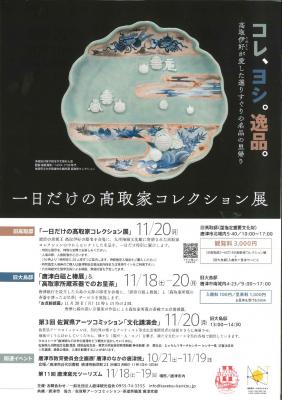 | 開催日 | 「一日だけの髙取家コレクション展」:2023年11月20日 「唐津白磁と椿展」&「髙取家所蔵茶器でのお呈茶」2023年11月18日~20日 「第3回 佐賀県アーツコミッション「文化講演会」」2023年11月20日  |