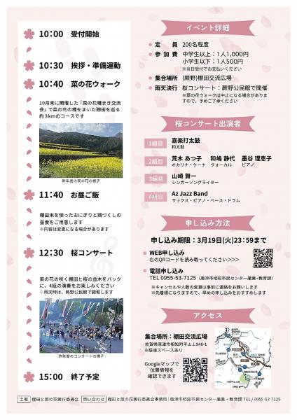 | 開催日 | 2024年3月31日(日) ※雨天決行(桜コンサートは蕨野公民館で開催) ※菜の花ウォークは中止になる場合があります。 |