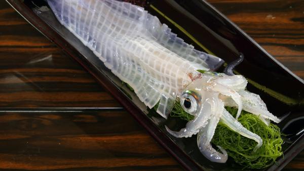 説明 ケンサキイカの活き造り。 平成29年3月撮影。