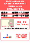 JR唐津線(佐賀方面)およびJR筑肥線(伊万里方面)において、交通系ICカードのご利用はできません。以下の点にご注意くださ...