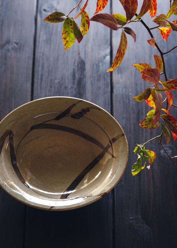 器や紅葉しかかった枝木が映えるよう画面上方奥からの逆光を取り入れ