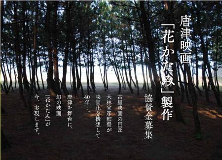 邦画界の巨匠・大林宣彦監督が40年以上映画化への想いを抱き続けた、檀一雄の純文学小説『花筐』。この小説は、唐津の風景を思い浮かべながら執筆されたと言われています。三島由紀夫をはじめ多くの文豪たちに影響を与えた名作に、大林監督が新たに映画としての命を吹き込みます。唐津映画製作推進委員会では、大林監督とともに、50年、100年後も人々に感動を与え、唐津の文化や風景が長く語り継がれる唐津映画『花かたみ』の実現のため、寄附金や共に古里映画を作ろうという仲間を募集します!