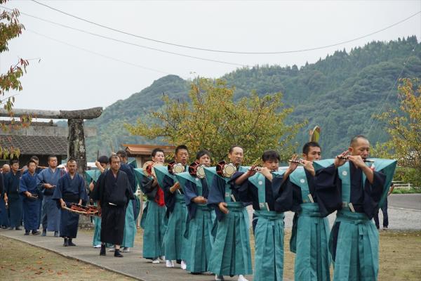 武家風の裃という勇壮ないでたちで鉦や太鼓、笛がおごそかに奉納されます。