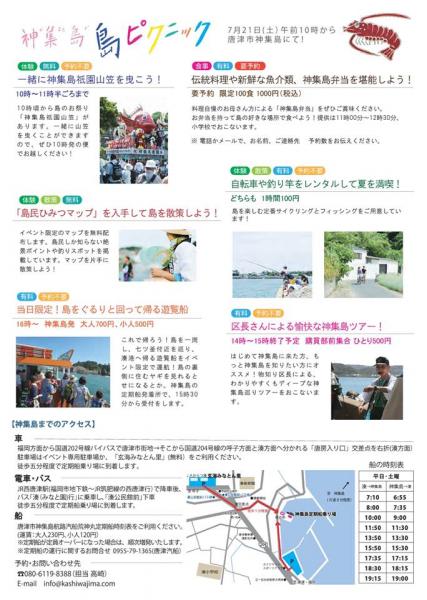 島ピクニックとは、そんなお母さんたちの作るお弁当を食べ、島を自由に散策するイベントです。当日は島のお祭りがあります。10:00発に乗車し、ぜひ一緒に山笠を曳きましょう!