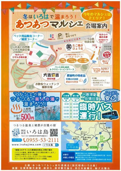 | アクセス | JR唐津駅~会場往復臨時バス通行! 行き便(唐津駅発) 9:30・11:00・12:30・14:00・15:30 帰り便(いろは島発) 10:00・12:00・13:30・15:00・16:00 |