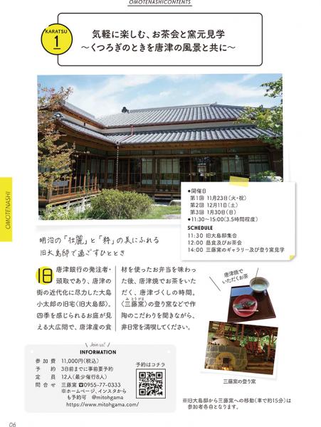 四季を感じられるお庭が見える大広間で、唐津産の食材を使ったお弁当を味わった後、唐津焼でお茶をいただく、唐津づくしの時間。