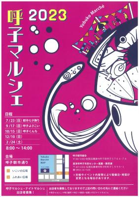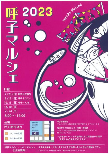 | 開催日 | ■呼子マルシェ 7月23日朝市七夕飾り 9月17日(日)呼子よさこい 【中止】 10月15日(日)呼子くんち 12月10日(日) 2024年 2月24日(日) ■呼子ナイトマルシェ 8月11日(金)花火大会 10月15日(日)呼子くんち 11月25日(土)イカすクリスマスツリー点灯式 |