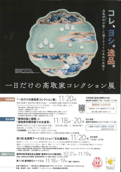 | 開催日 | 「一日だけの髙取家コレクション展」:2023年11月20日 「唐津白磁と椿展」&「髙取家所蔵茶器でのお呈茶」2023年11月18日~20日 「第3回 佐賀県アーツコミッション「文化講演会」」2023年11月20日 |
