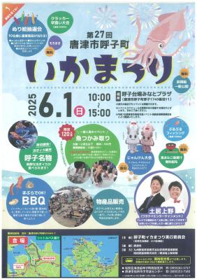 2025年6月1日に開催される「第27回唐津市呼子町いかまつり」は、呼子名物の活きイカ販売をはじめ、魚つかみ取りや手ぶらで楽しめるBBQ、物産品販売、じゃんけん大会、ぬり絵抽選会など、子どもから大人まで楽しめるイベントが盛りだくさんです。人気芸人・土居上野のステージや、巡視船の一般公開も予定されており、家族で一日中楽しめる内容になっています。