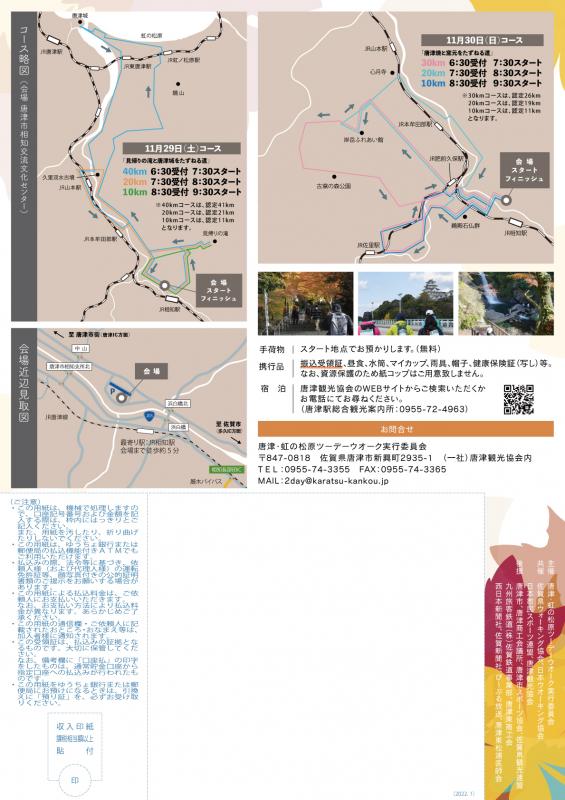 | 電話番号 | 0955-74-3355(唐津観光協会内 唐津・虹の松原ツーデーウオーク実行委員会) |