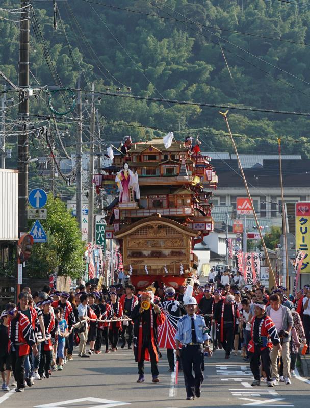 そろいの赤い法被姿の住民たちが曳きまわります。