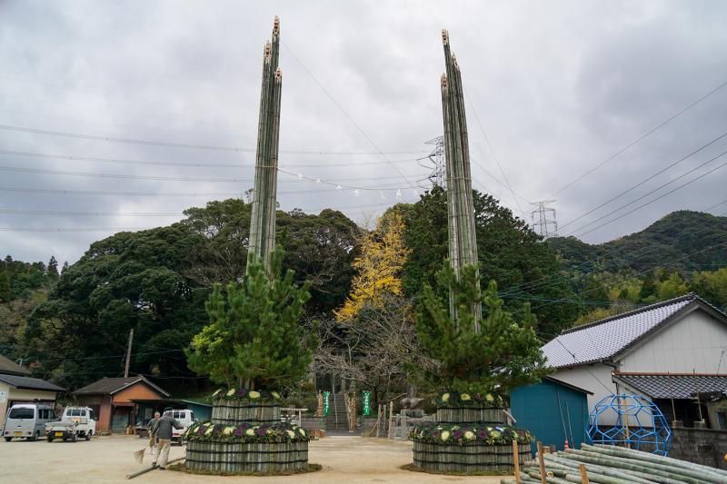唐津市宇木にある宝満神社では、毎年、年末年始に高さ15mを超える大門松を作り、参拝客を迎えています。