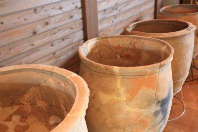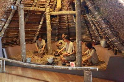 末盧館は、古代の高床式倉庫をイメージして建設(左写真)し、日本稲作発祥の地「菜畑遺跡」の展示を行っています。特別展示室には、邪馬台国時代の「末盧国」の代表遺物を展示し、出あいふれあいの広場には、遺跡公園として、日本最古の稲作ムラの竪穴式住居、日本最古の水田、縄文の森を復元しています。