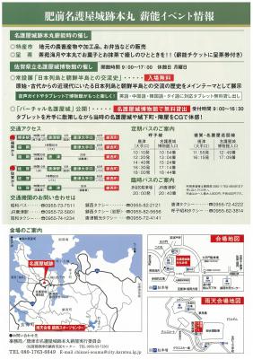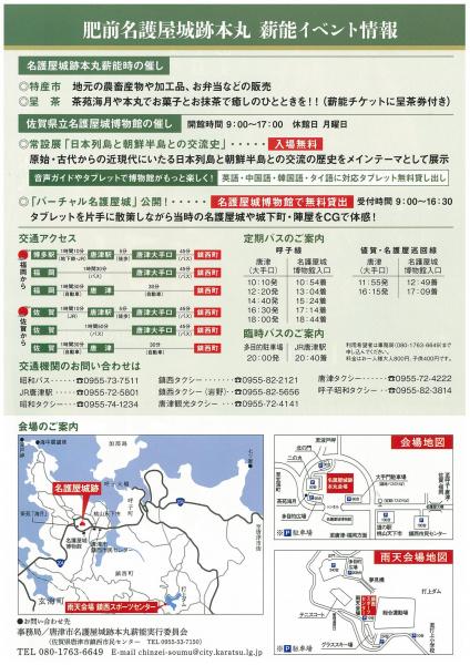 | 電話番号 | 080-1763-6649(唐津市名護屋城跡本丸薪能実行委員会) 0955-53-7150(鎮西市民センター総務教育課)  |
