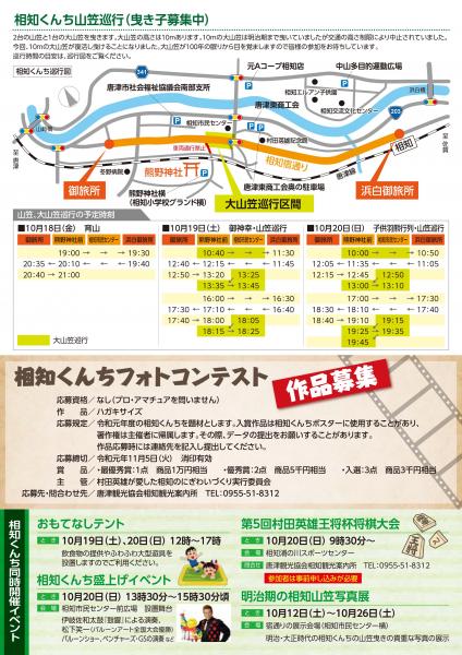 | 駐車場 | 唐津市社会福祉協議会南部支所、元Aコープ相知店、唐津東商工会、中山多目的運動広場、唐津東商工会奥駐車場、をご利用ください。 |