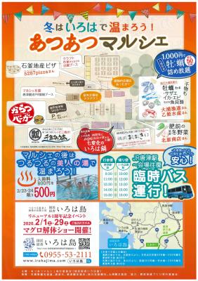 | 교통 수단 | JR唐津駅~会場往復臨時バス通行! 行き便 唐津駅発: 9:30・11:00・12:30・14:00・15:30 帰り便 いろは島発: 10:00・12:00・13:30・15:00・16:00 |