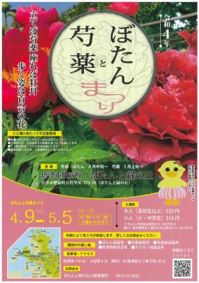 | 電話番号 | 0955-53-2032(ぼたんと緑の丘公園事務所) 0955-53-7145(ぼたんと芍薬まつり実行委員会)  |