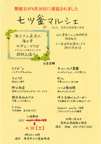 • 七ツ釜マルシェ ※荒天が予想されるため、開催日が変更されました。