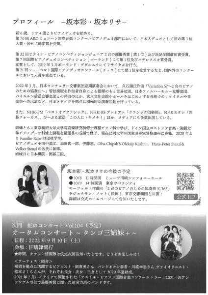 • 虹のコンサート vol.103 Summer Concert 坂本彩・坂本リサ ピアノデュオリサイタル