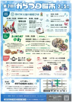 | 時間 | 第67回五福の縁結び市 10:00~15:00 SUNDAY中町 11:00~15:00 KARAE 11:00~16:00 |