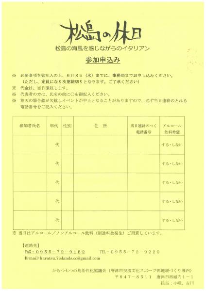 電話番号 0955-72-9220(唐津市交流文化スポーツ部地域づくり課離島地域コーディネーター 小峰)