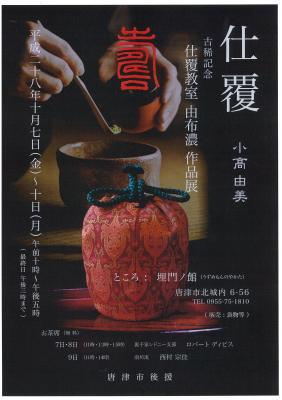 HOME 唐津の9つの魅力 가라쓰의 소개 가라쓰의 소개 唐津グルメのご紹介 観光地のご紹介 祭り・イベントのご紹介 가라쓰야키 소개 特産品のご紹介 숙박시설 소개 歴史・文化のご紹介 음식 唐津グルメのご紹介 ジャンル検索 관광지 観光地のご紹介 관광 명소 검색 체험 체험 프로그램 검색 축제・이벤트 祭り・イベントのご紹介 ジャンル検索 가라쓰야키 가라쓰야키 소개 ジャンル検索 특산품 特産品のご紹介 ジャンル検索 숙박시설 숙박시설 소개 ジャンル検索 역사・문화 歴史・文化のご紹介 ジャンル検索 交通アクセス 新着情報 모델 코스 唐津のおすすめ パンフ・ガイドマップ フォトライブラリー 동영상 집 검색 순위 자주 묻는 질문 Facebook リンク集 閉じる Language 日本語 English 中文(簡体字) 中文(繁体字) 검색 순위 イベントを検索する 仕覆 小髙由美 古稀記念 仕覆教室 由布濃 作品展終了しました 가라쓰 시가지 歴史・文化・芸術 開催日 平成28年10月7日(金)~10日(月) 時間 開催時間 10:00~17:00(最終日 15:00まで) 住所 唐津市北城内6-56(埋門ノ館) 電話番号 0955-75-1810(埋門ノ館) 料金 お茶席:無料 関連資料 ポスター [PDF] 駐車場 近くに有料Pあり(南城内駐車場、旧高取邸駐車場) 교통 수단 「JR唐津駅」より徒歩約15分 Tweet 地図 ナビ起動
