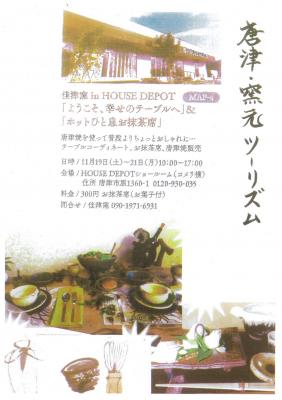 HOME 唐津の9つの魅力 가라쓰의 소개 가라쓰의 소개 唐津グルメのご紹介 観光地のご紹介 祭り・イベントのご紹介 가라쓰야키 소개 特産品のご紹介 숙박시설 소개 歴史・文化のご紹介 음식 唐津グルメのご紹介 ジャンル検索 관광지 観光地のご紹介 관광 명소 검색 체험 체험 프로그램 검색 축제・이벤트 祭り・イベントのご紹介 ジャンル検索 가라쓰야키 가라쓰야키 소개 ジャンル検索 특산품 特産品のご紹介 ジャンル検索 숙박시설 숙박시설 소개 ジャンル検索 역사・문화 歴史・文化のご紹介 ジャンル検索 交通アクセス 新着情報 모델 코스 唐津のおすすめ パンフ・ガイドマップ フォトライブラリー 동영상 집 검색 순위 자주 묻는 질문 Facebook リンク集 閉じる Language 日本語 English 中文(簡体字) 中文(繁体字) 검색 순위 イベントを検索する 2016唐津窯元ツーリズム 佳津窯in HOUSE DEPOT「ようこそ、幸せのテーブルへ」&「ホットひと息お抹茶席」終了しました 가라쓰 시가지 唐津焼 開催日 平成28年19日(土)~21日(月) 時間 10:00~17:00 住所 唐津市原1360-1(HOUSE DEPOTショールーム(コメリ横)) 電話番号 090-1971-6931(佳津窯) 料金 300円 お抹茶席(お菓子付) Tweet 地図 ナビ起動