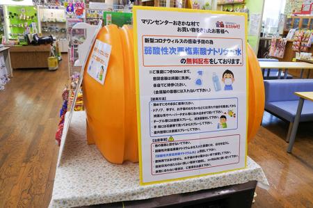 マリンセンターおさかな村でお買い物されたお客様へ新型コロナウイルスの感染予防のため、弱酸性次亜塩素酸ナトリウム水の無料配布をしております。