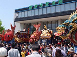 唐津神社春季例大祭 (春まつり)は、唐津くんち本番を半年後にひかえた4月29日に実施されます。曳山取締会や氏子総代等が参加して神社本殿で行われる神事が主な行事なのですが、見物客のお目当ては、やはり参道に勢揃いする14台の曳山です。この日だけは、自由に曳山に触ったり、子供を乗せて記念写真を撮ることもできるので、大勢の見物客で参道は賑わいます。
