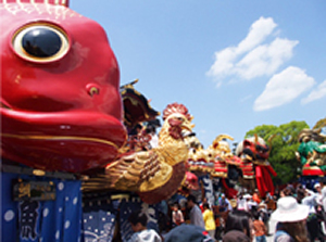 この曳山のうち明治中期に焼失したといわれる1台を除き14台が現存しています。曳山は、獅子や兜などの巨大な漆工芸品を台車に載せたもので、これを数百人で曳きます。