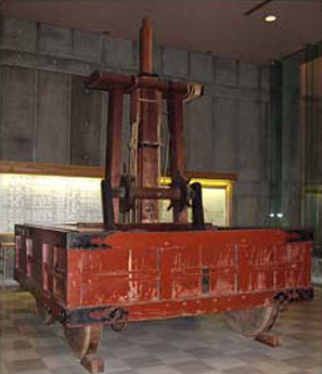 13番曳ヤマ山水主町(かこまち)・鯱が、昭和50年まで使用した台車(明治9年制作)。柱下部の滑車により、上部に見える