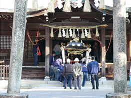 9番曳山木綿(きわた)町の曳子衆の手で、本殿へ運び込まれるお神輿