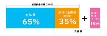給付額の内、70%は旅行代金の割引に、30%は旅行先で使える地域共通クーポンとして付与されます。