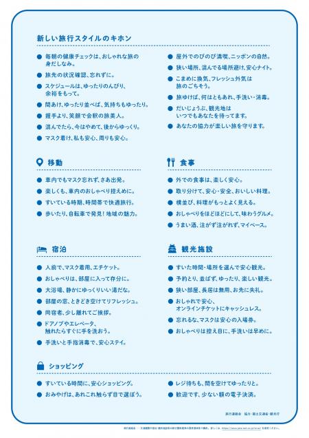 Go To トラベル事業は、ウィズコロナの時代における「新しい生活様式」に基づく旅のあり方を普及、定着させるものです。次の内容を必ず守り、安全・安心なご旅行をお願いします。