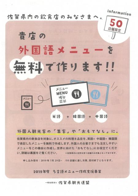 佐賀県内の飲食店を対象に、オススメの料理8品目を、英語+中国語+韓国語で表記したメニューを無料で作成します。
