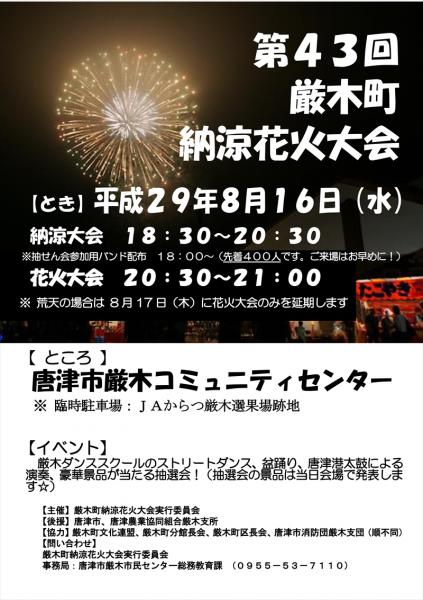 | 開催日 | 平成29年8月16日(水) ※悪天候の場合、8月17日(木)に花火大会のみ延期。 |