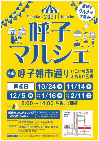 開催日 令和4年2月11日(金曜日・祝日)に予定されていた「第5回呼子マルシェ」は、新型コロナウイルスの感染拡大防止のため、3月に延期となりました。