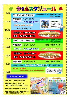 ドゲンジャーズショー、お面やスライムづくり、子供縁日、キッチンカーなどを準備しています。